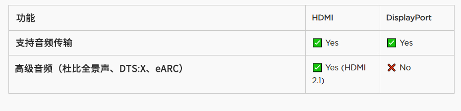 結論:如果您正在設置家庭影院系統,HDMI是明顯的贏家,因為它支持杜比全景聲和eARC等高級音頻格式。DisplayPort可以傳輸音頻,但它缺乏HDMI中的高級音頻功能。