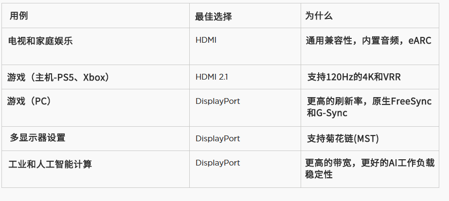 結論:與HDMI相比,DisplayPort提供了更高的帶寬和更高的分辨率,使其成為面向未來、高性能顯示器和人工智能驅動應用的更好選擇。然而,對于4K 120Hz的游戲機和娛樂設置來說,HDMI 2.1仍然是一個不錯的選擇。