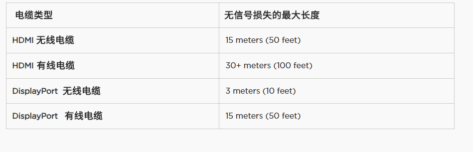 結論:HDMI是長距離連接(如家庭影院、投影儀)的更好選擇,因為無源HDMI電纜的長度可達15米,而DisplayPort電纜的信號質量在3米以上就會損失,除非使用有源電纜。
